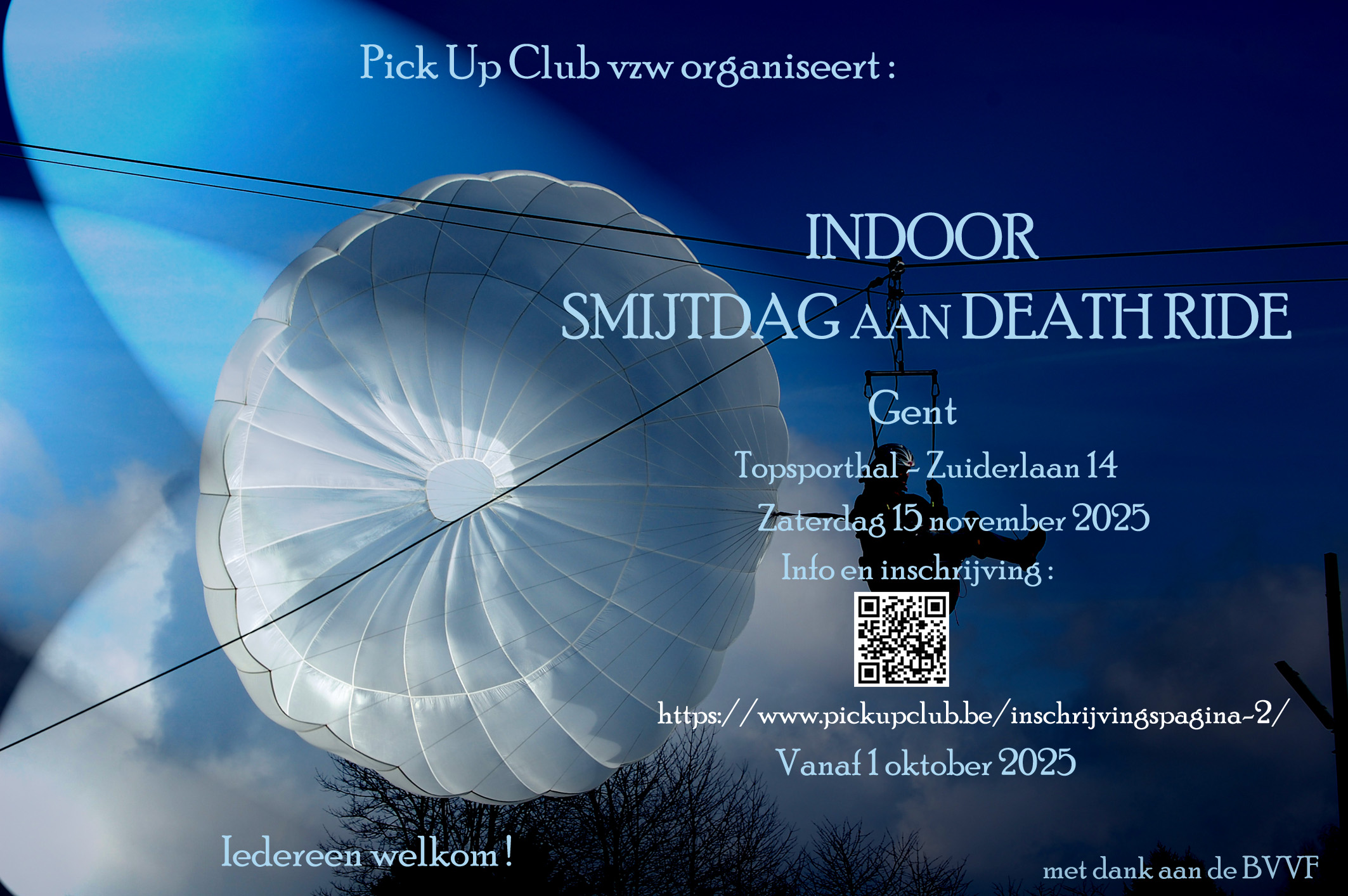 Indoor parachutewerpdag aan deathride op 15 november te gent Afdrukken Delen Gepubliceerd op 30 september 2025 Kruimelpad Home Nieuws Inschrijving mogelijk vanaf 1 oktober op: https://www.pickupclub.be/inschrijvingspagina-2/