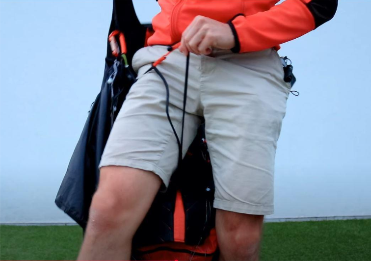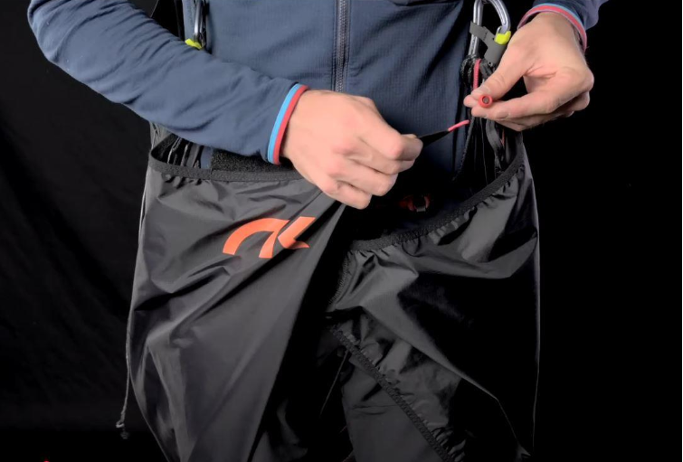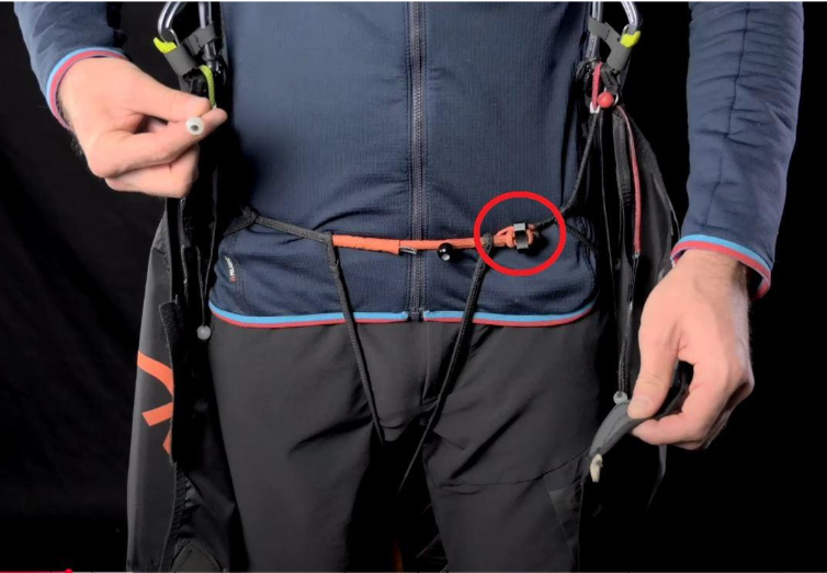 Het Niviuk Arrow P -harnas werd gevonden met een ontgrendeld gordelsysteem (been- en voorgordel). De beenzak was echter gesloten. Bij dit type harnas is het noodzakelijk om met het rechterbeen in de gesloten beenriem van het Getup gordelsysteem te stappen (afbeelding 1).
