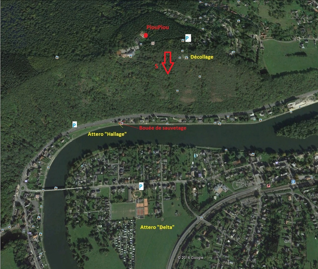 Tussen de Maas en de viervaksbaan, rechts ten opzichte van de start (groen terrein op het plan). Zeer kleine en mogelijks ERG TURBULENTE landingsplaats. Het bezoek aan de landingsplaats is VERPLICHT vooraleer op deze site te vliegen. De aanvlucht gebeurt boven de Maas, maar opgelet voor valwinden of voor veranderingen van de windrichting.