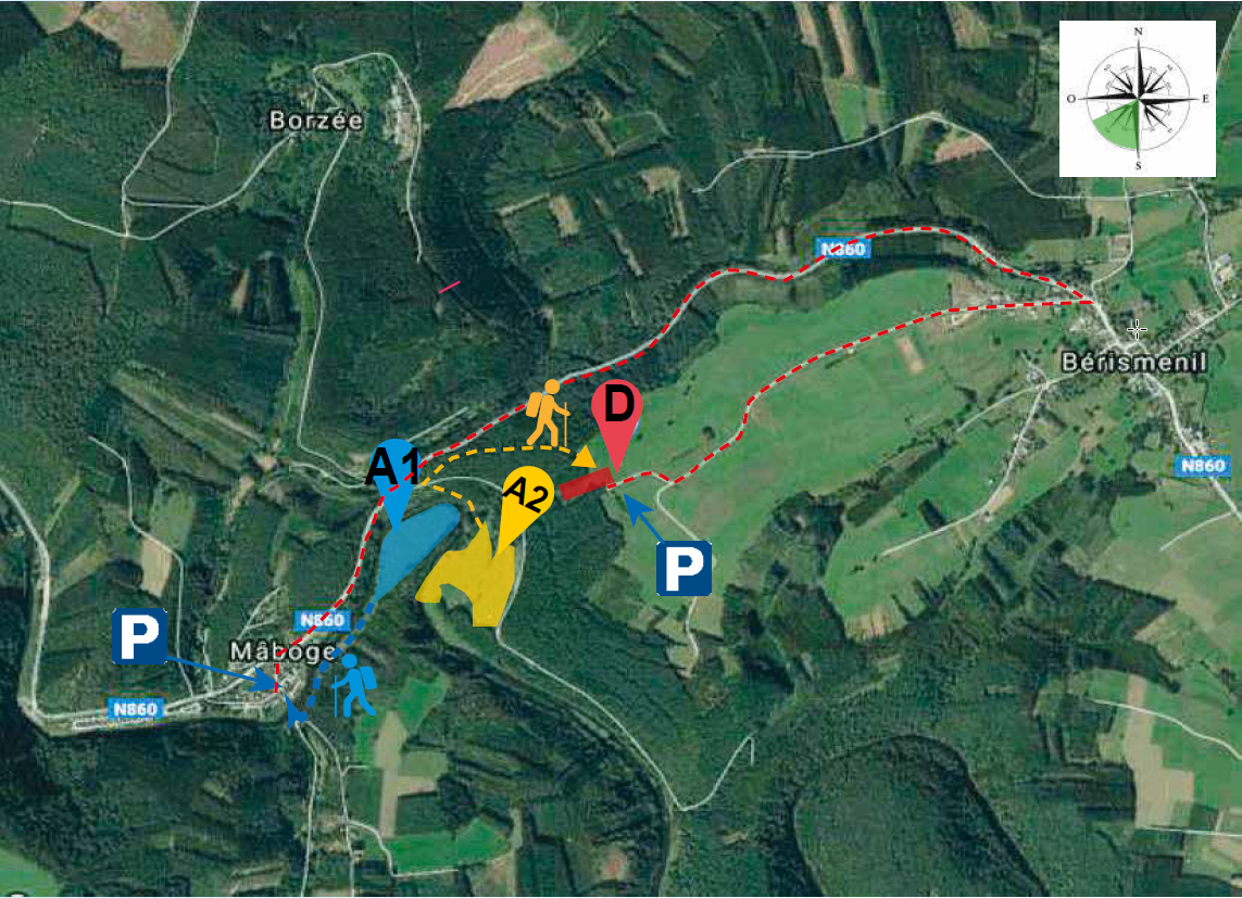 - Met de wagen via de weg Maboge - Bérismenil. Men moet absoluut parkeren aan de rand van het bos en te voet naar de landing gaan.