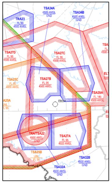 Burgerpiloten worden uitgenodigd om de coördinatiebriefing en NOTAMs te lezen met betrekking tot de volgende gebieden: TSA 32B, TSA 34B en natuurlijk het gecontroleerd luchtruim > 4500ft AMSL.